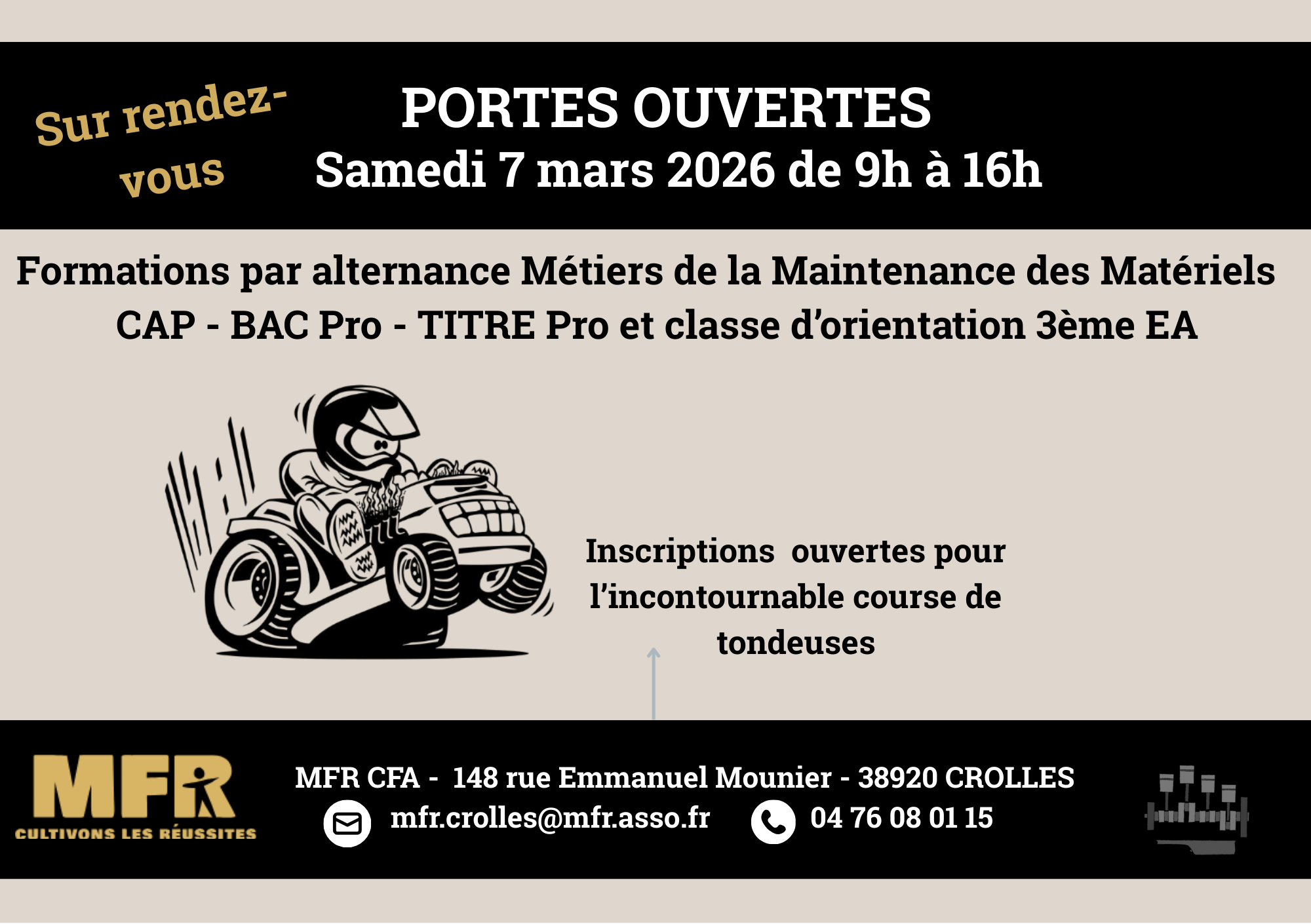 La MFR de Crolles organise une journée porte ouverte le samedi 7 mars 2026 de 9h00 à 16h00, c’est pourquoi nous nous permettons de vous transmettre la communication de cette journée ainsi que les plaquettes des formations dispensées au sein de notre établissement dans les domaines :