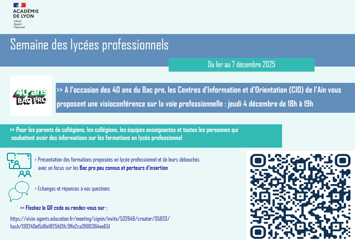 Le CIO de l'Ain organise un webinaire de présentation des filiaires d'enseignement professionnel, le jeudi 4 décembre 2025 à 18h.